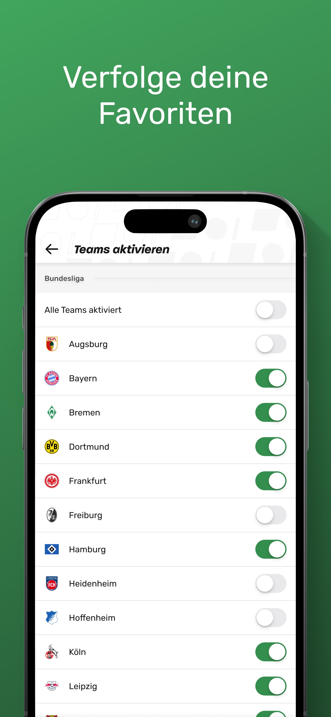 Wähle deine Lieblingsteams aus über 100 Wettbewerben und erhalte alle Tore per Push-Nachricht live auf dein Smartphone. So bist du immer der Erste in deinem Freundeskreis, der jubelt.