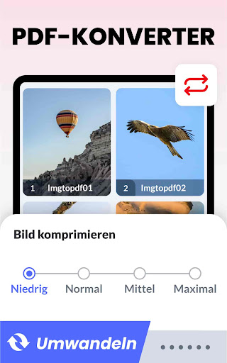 Der Bild-in-PDF-Konverter kann Bilder (z. B. jpg, jpeg, png) in PDF umwandeln. Die App ist leicht zu bedienen und zu 100% kostenlos. Jetzt testen!