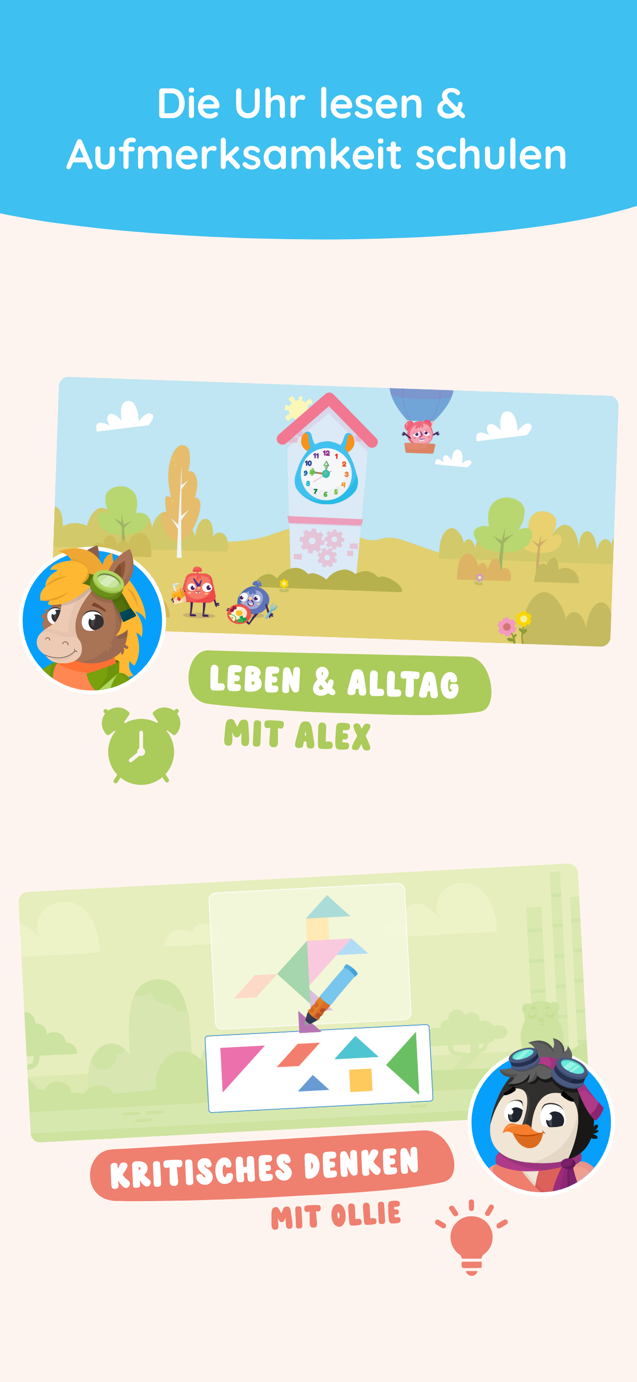 Kinder begeben sich je nach gewähltem Lerninhalt gemeinsam mit unterschiedlichen Spielfiguren auf Lernreisen in unbekannte Welten. Sie befreien diese jeweils durch über 20 Lernspiele von den kleinen, süßen Chaosmonstern. In der „Welt der Worte“ unterstützen sie beispielsweise die Füchsin Mika darin, Ordnung zu schaffen und erlernen dabei Grundkenntnisse für das Lesen und Schreiben. Die Spiele sind auch nach der Freischaltung aller Lerninhalte beliebig oft wiederholbar und werden in Updates zusätzlich durch kleinere Spiele ergänzt.