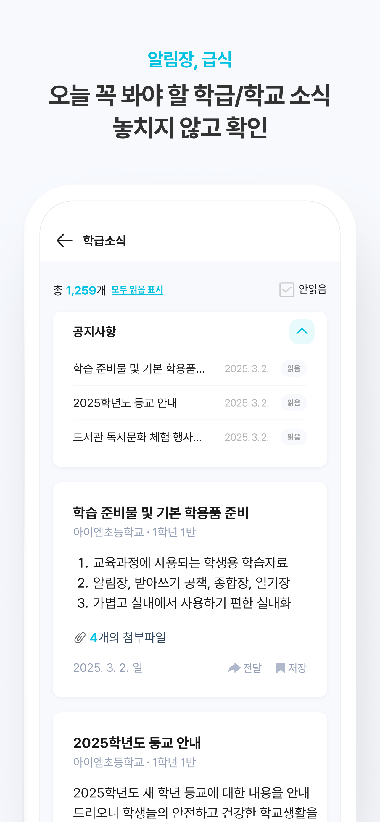 - 학교 공지사항, 가정통신문, 학급 알림장을 잊지 않고 준비할 수 있도록 한눈에 새로운 소식들을 볼 수 있어요.