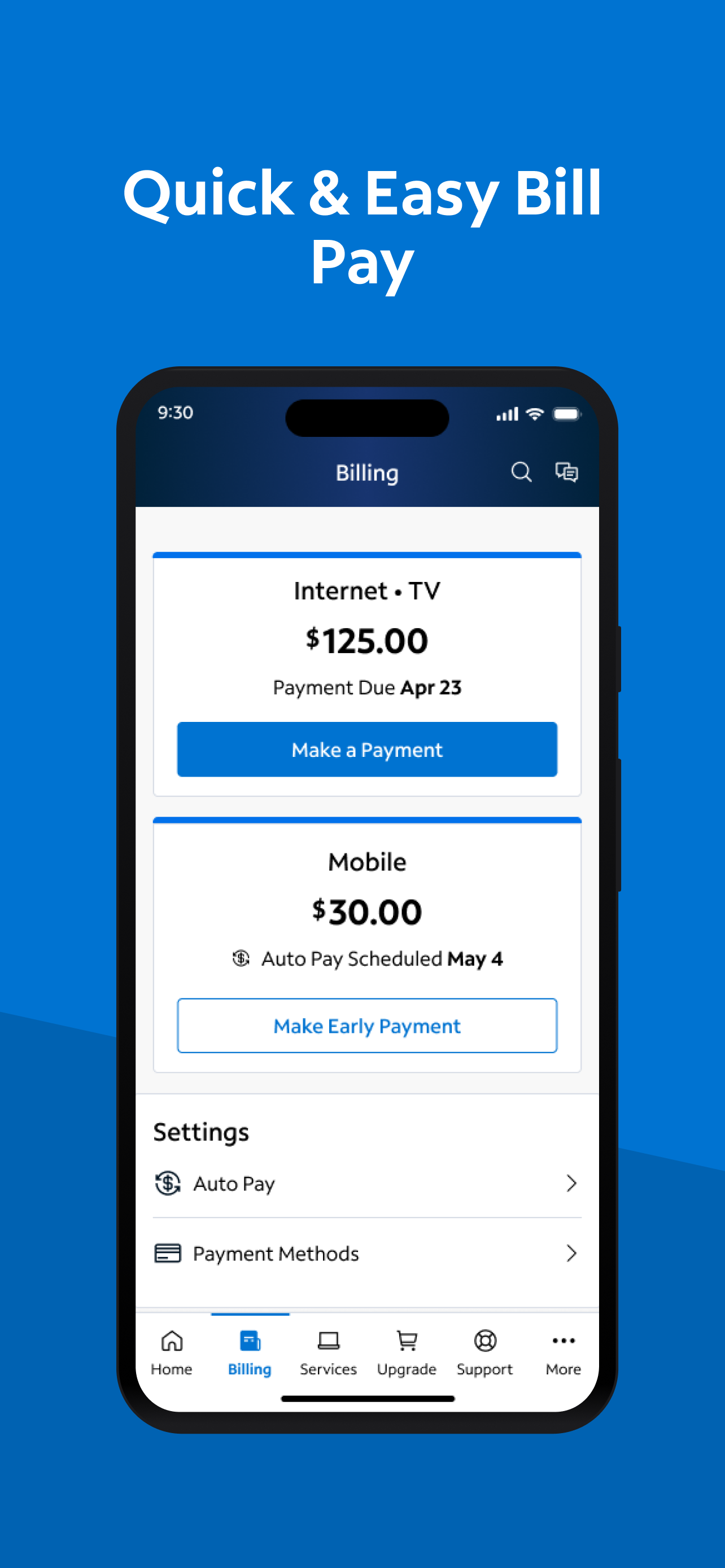 • Get billing, equipment, activation and outage notifications right on the home screen.