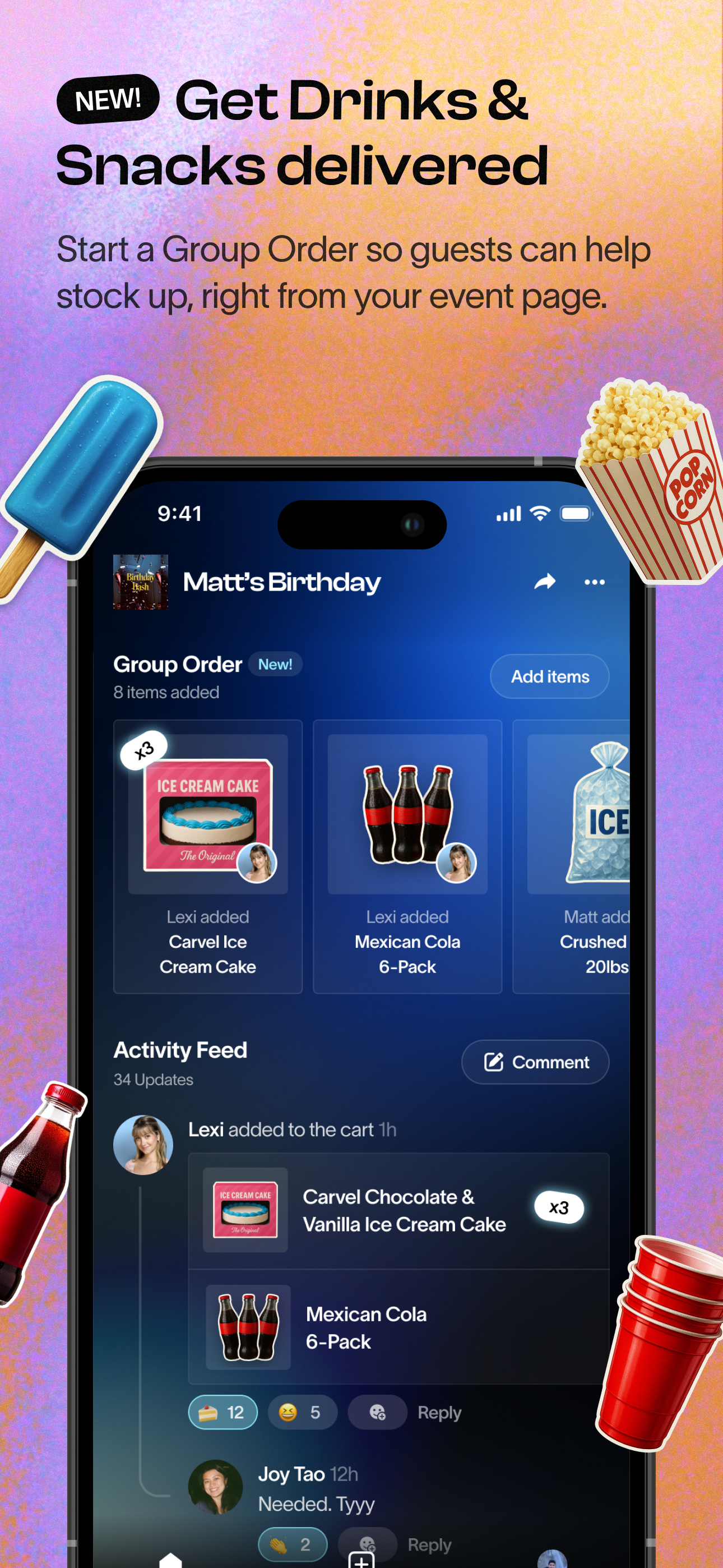 - Create pages for any event — birthdays, pregames, kickbacks, dinners, date nights, game nights, watch parties, pickup games, group trips, bachelor/bachelorettes, weddings, and more