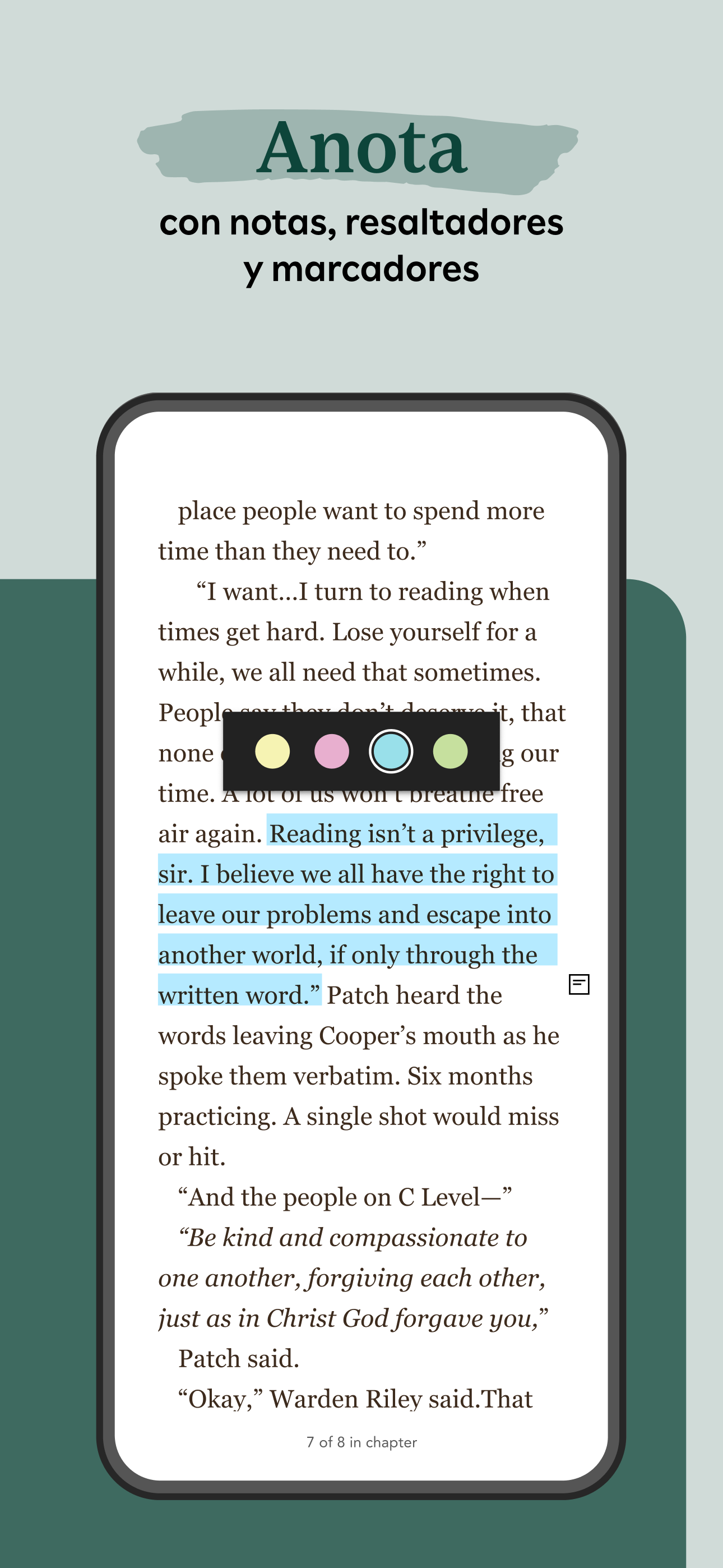 • Continuar en el punto donde lo dejaste. Sincronizaremos tus marcadores, notas y resaltes para que puedas seguir leyendo en cualquiera de los dispositivo que uses.