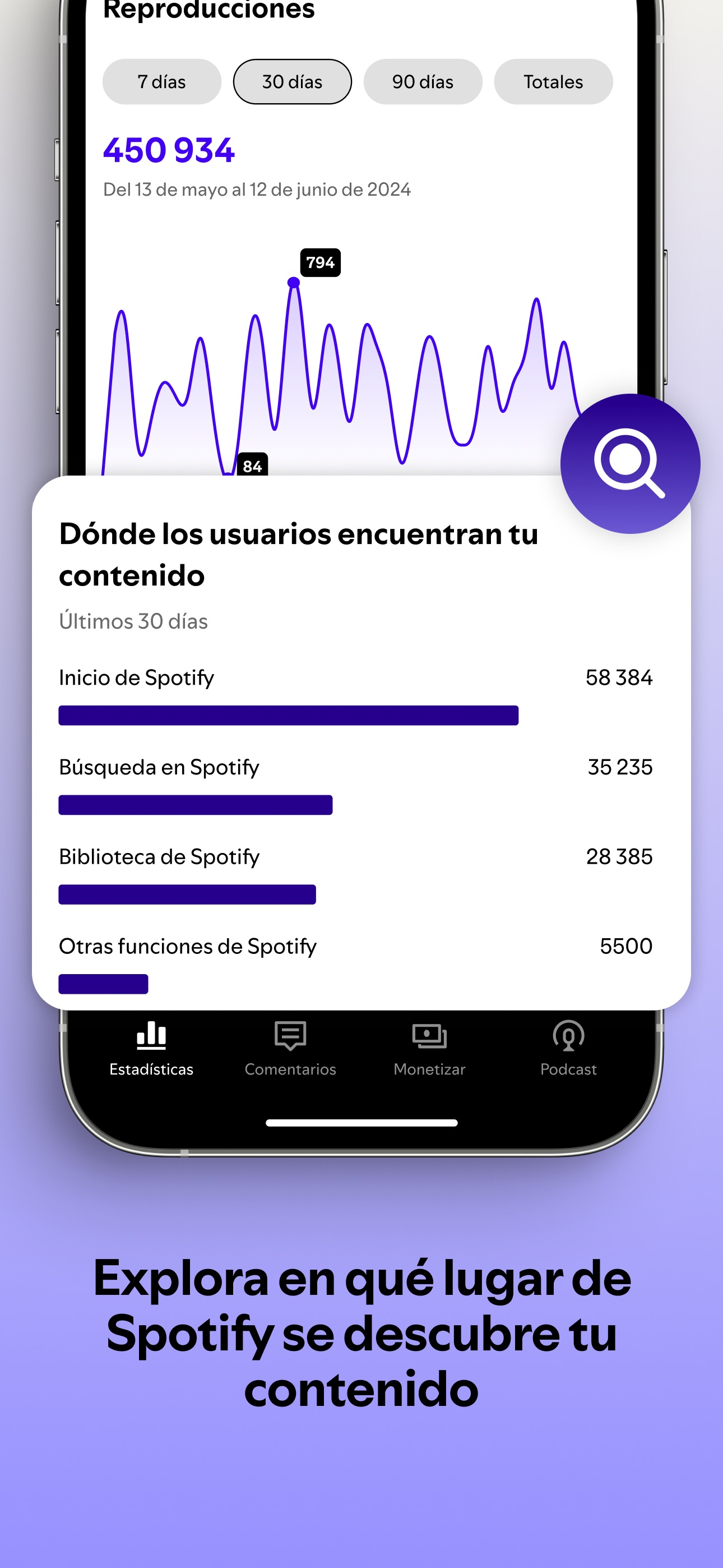 Los fans recurren a Spotify para descubrir podcasts nuevos. Aprovecha esta audiencia usando Spotify for Creators para subir tus episodios, conectarte con tus fans y explorar tus estadísticas de podcasts en Spotify. Con Spotify for Creators, los creadores de podcasts y videos pueden hacer lo siguiente: