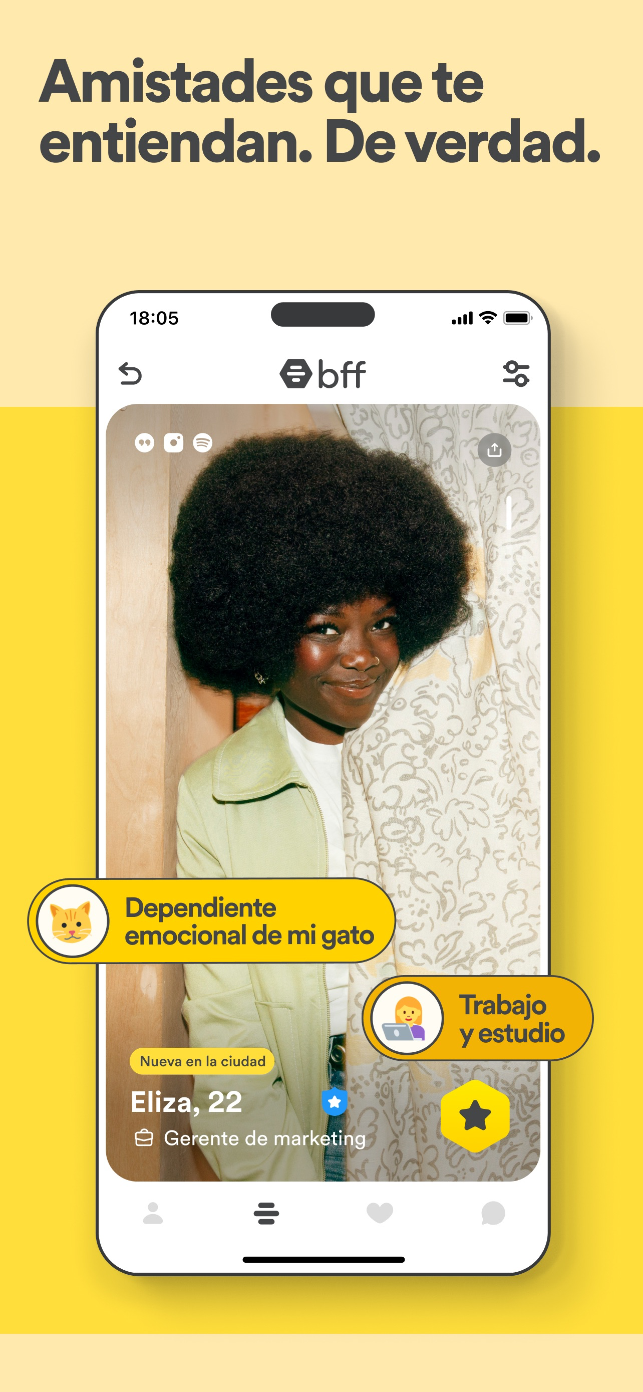 Conexiones auténticas: Incluimos características de la aplicación, como preguntas de perfil e insignias de estilo de vida, para que las personas puedan mostrarse de una manera verdadera a sí mismas. Esto te permite encontrar amistades reales y auténticas en tu ciudad.