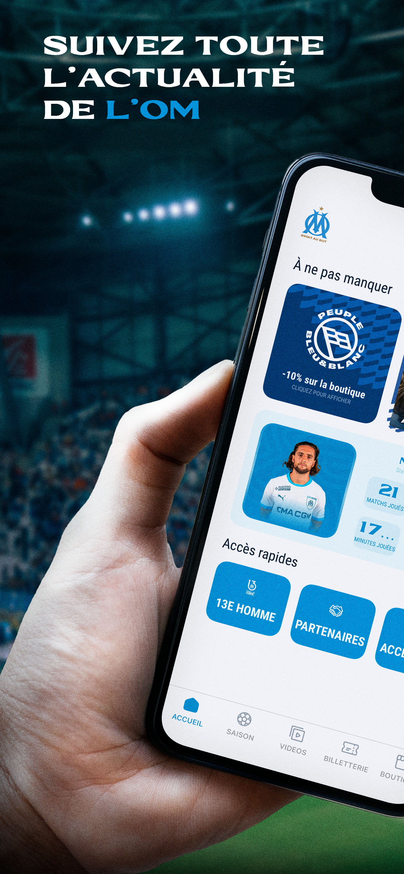Suivez l’OM où que vous soyez, avec toutes les fonctionnalités et avantages de notre application mobile. Téléchargez-la dès maintenant et ne manquez rien de votre club préféré !