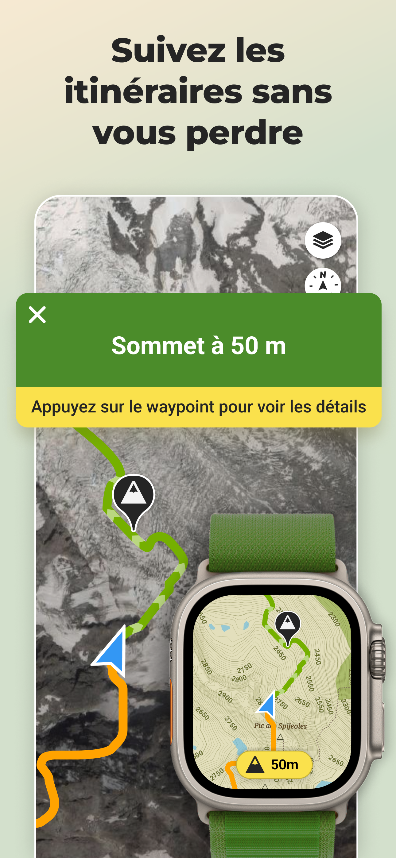 - Transformez votre mobile en navigateur GPS. Votre smartphone vous guidera avec un indicateur de cap et des alertes sonores pour vous avertir si vous allez hors-piste pendant la navigation.
