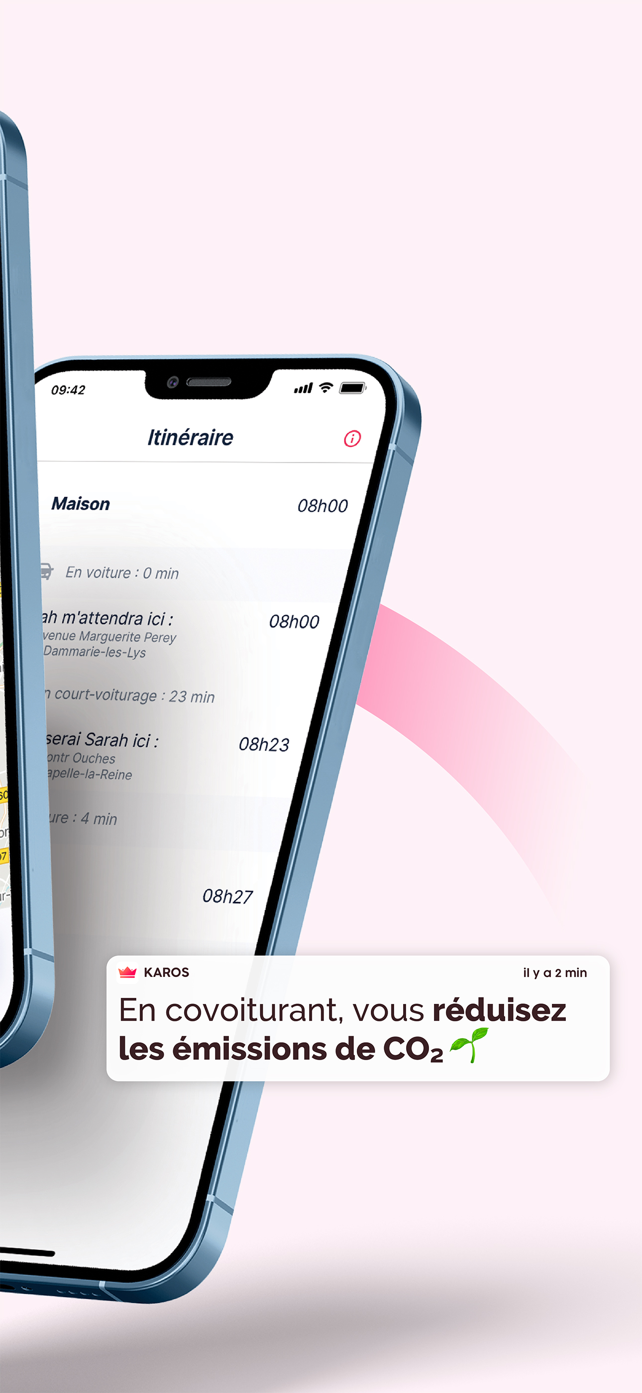 Karos s’adapte à vos habitudes pour vous trouver automatiquement les covoitureurs les plus pertinents. Vous avez le choix et en 2 clics votre covoiturage est validé. En plus, vous bénéficiez de plusieurs avantages : vous faites des économies, vous rencontrez des gens sympas et vous faites du bien à la planète.