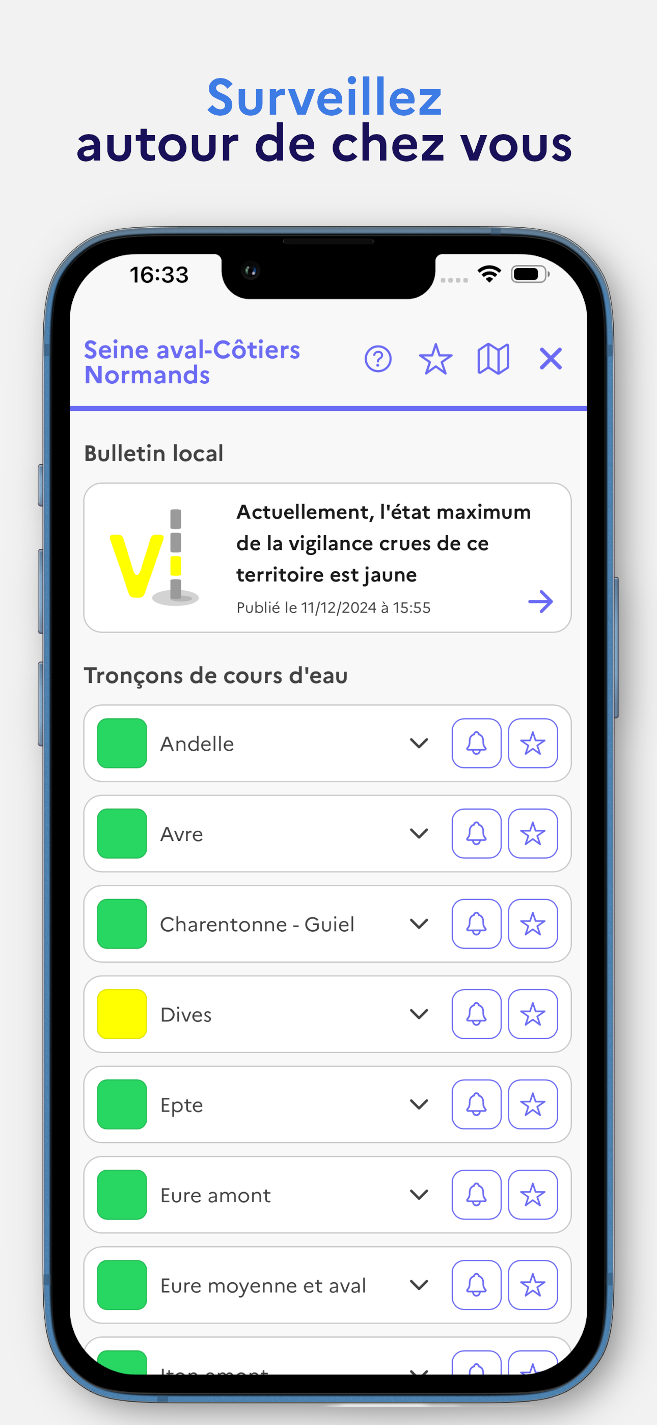 - niveau de vigilance crues (vert/jaune/orange/rouge) ;