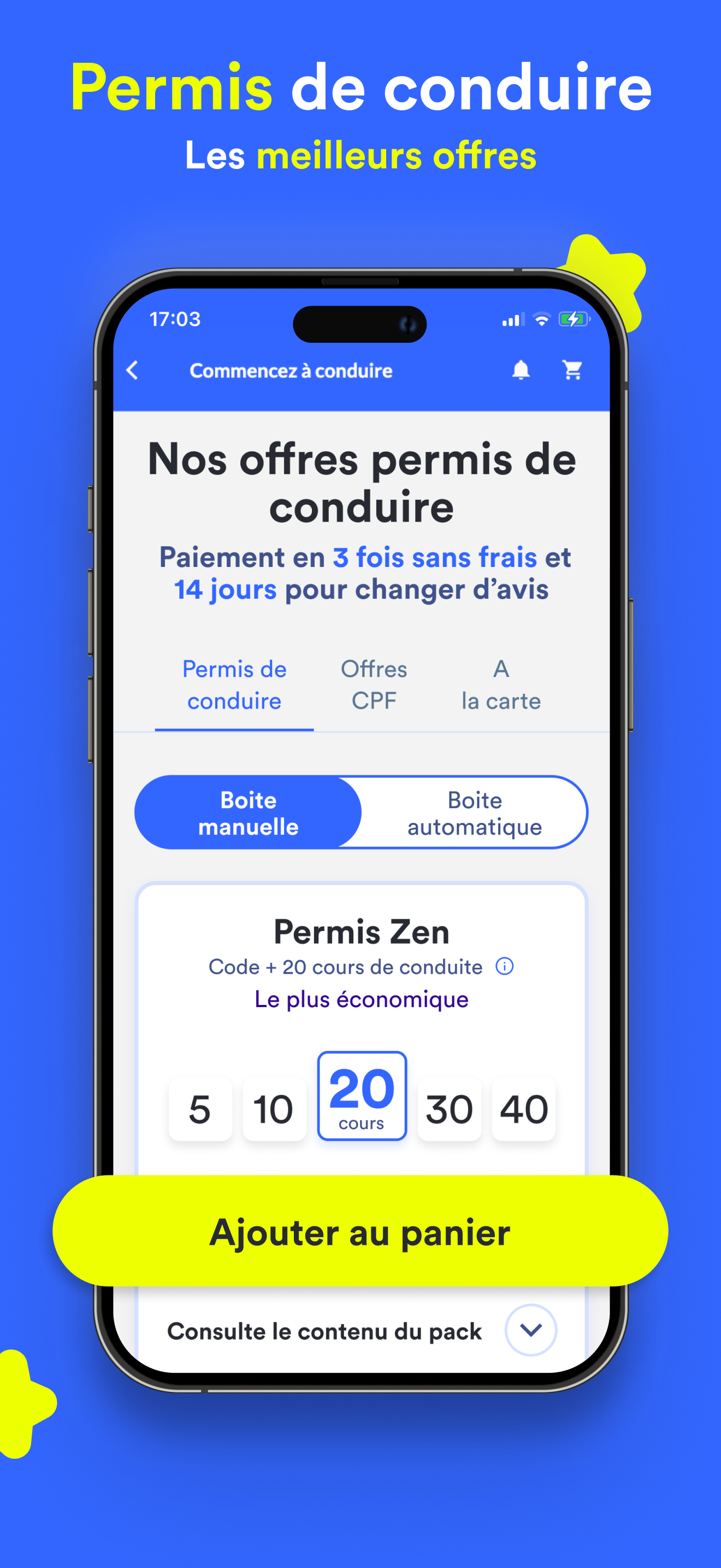 - Pour le permis de conduire (permis B, AAC et CS) : le suivi de ta formation, la gestion de ton planning et de tes cours de conduite en fonction de tes préférences (points de cours, enseignants, jours, horaires, etc.)