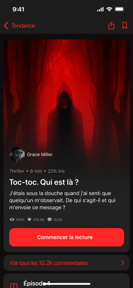 Profitez d’une expérience de lecture fluide avec notre application. Vous pouvez facilement suivre le temps restant dans chaque chapitre et l’ensemble de l’histoire. Aimez vos histoires préférées d’un simple tapotement et ajoutez d’autres à vos favoris pour une lecture future. Consultez une liste des histoires que vous avez déjà terminées et celles que vous avez hâte de commencer.