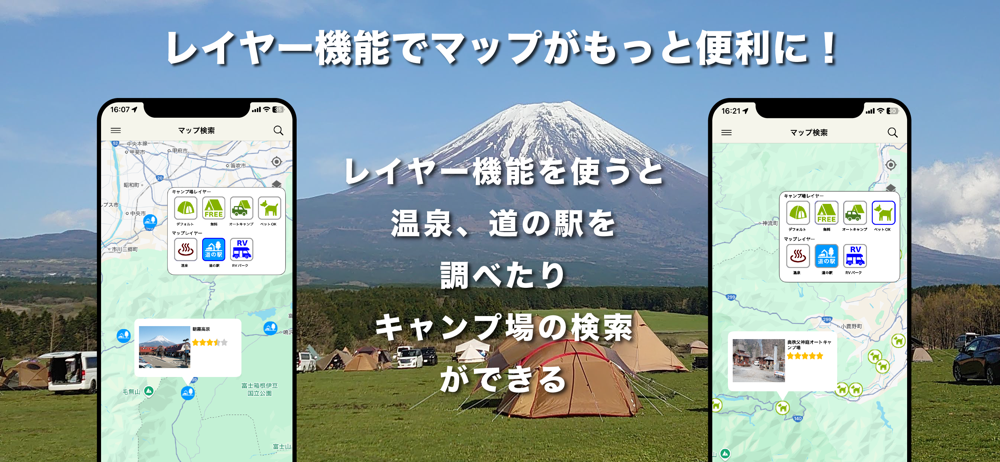 マップ検索ページの左上にあるレイヤーボタンからキャンプ場レイヤー、マップレイヤーを選択して表示させることができます。
