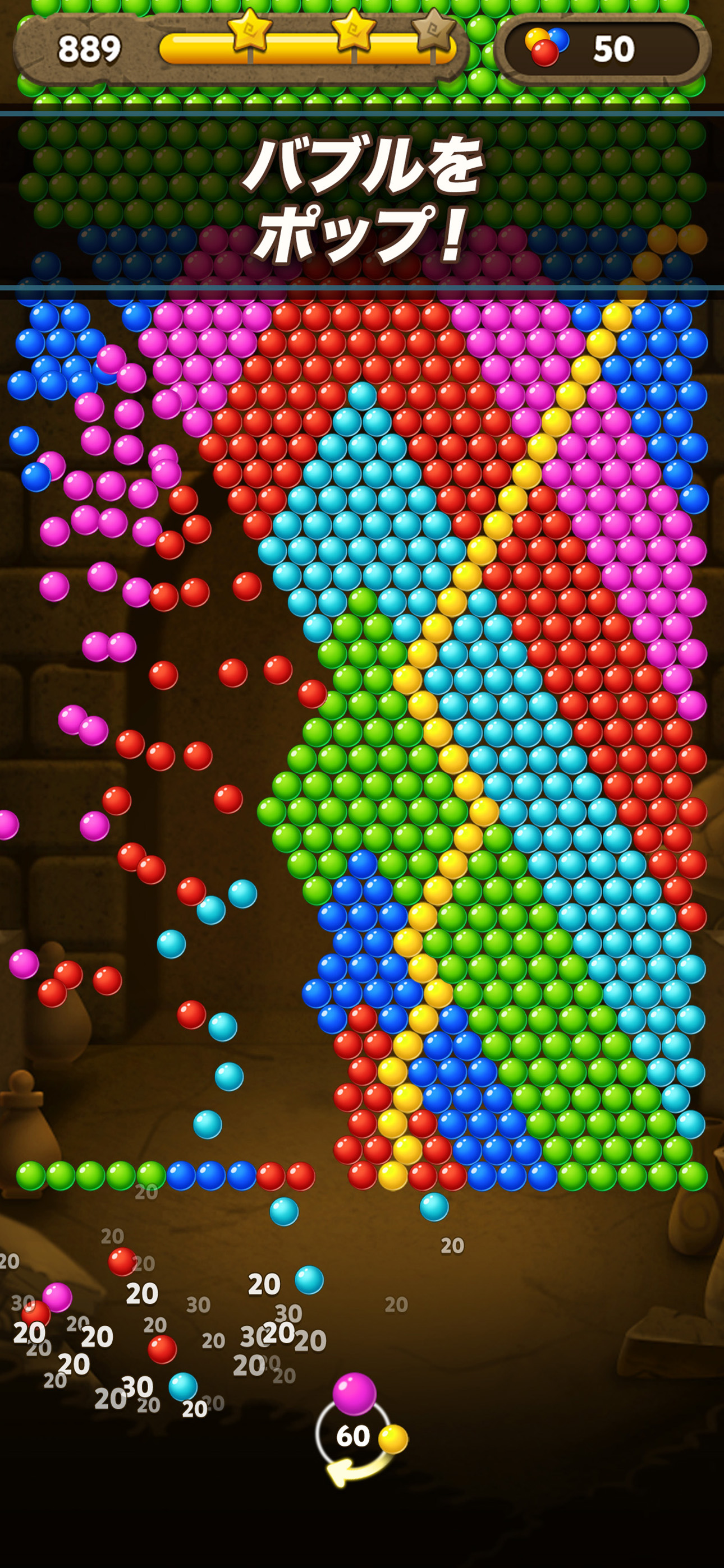 • 発射したバブルの数が少ないほど高いスコアが取れるよ
