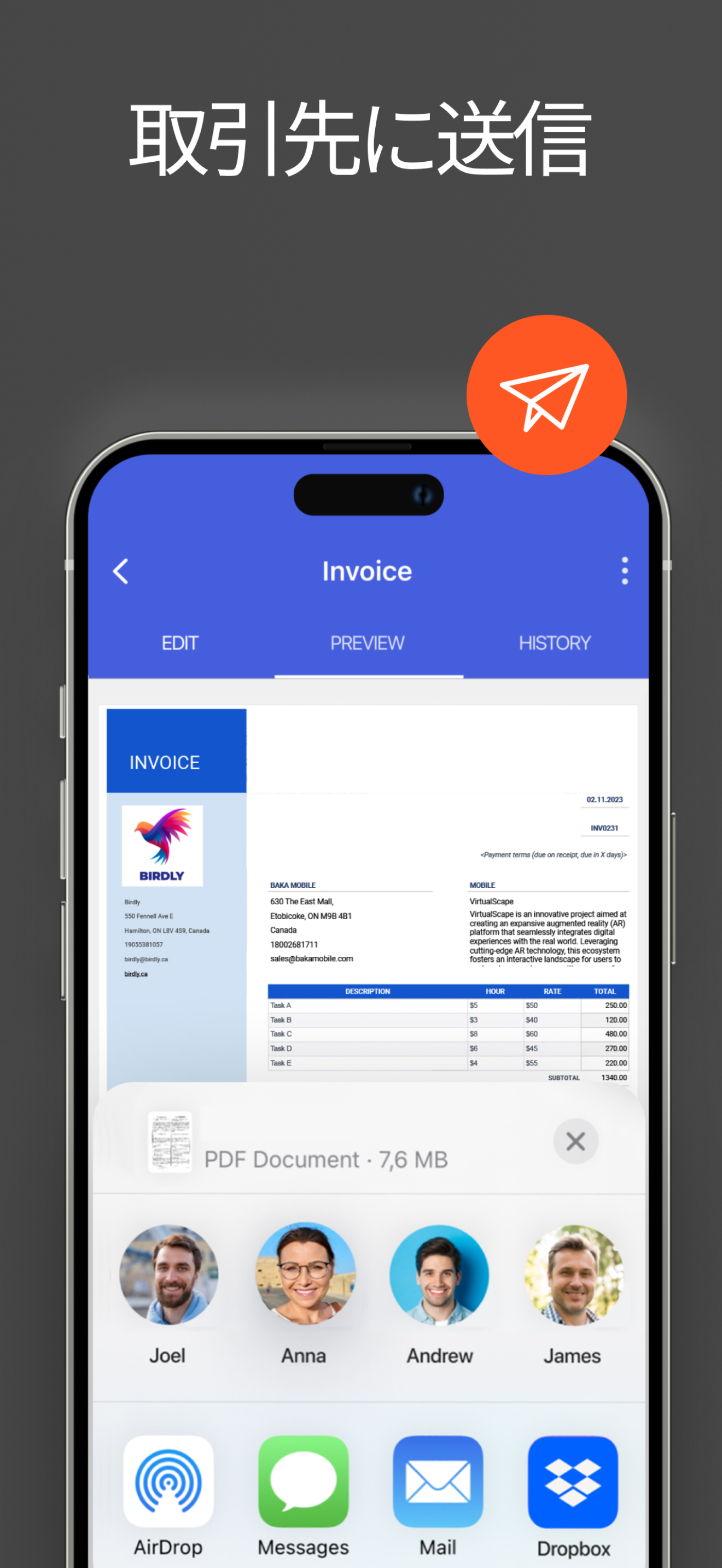 ・モバイルから直接送信できる、プロフェッショナルな仕上がりの請求書