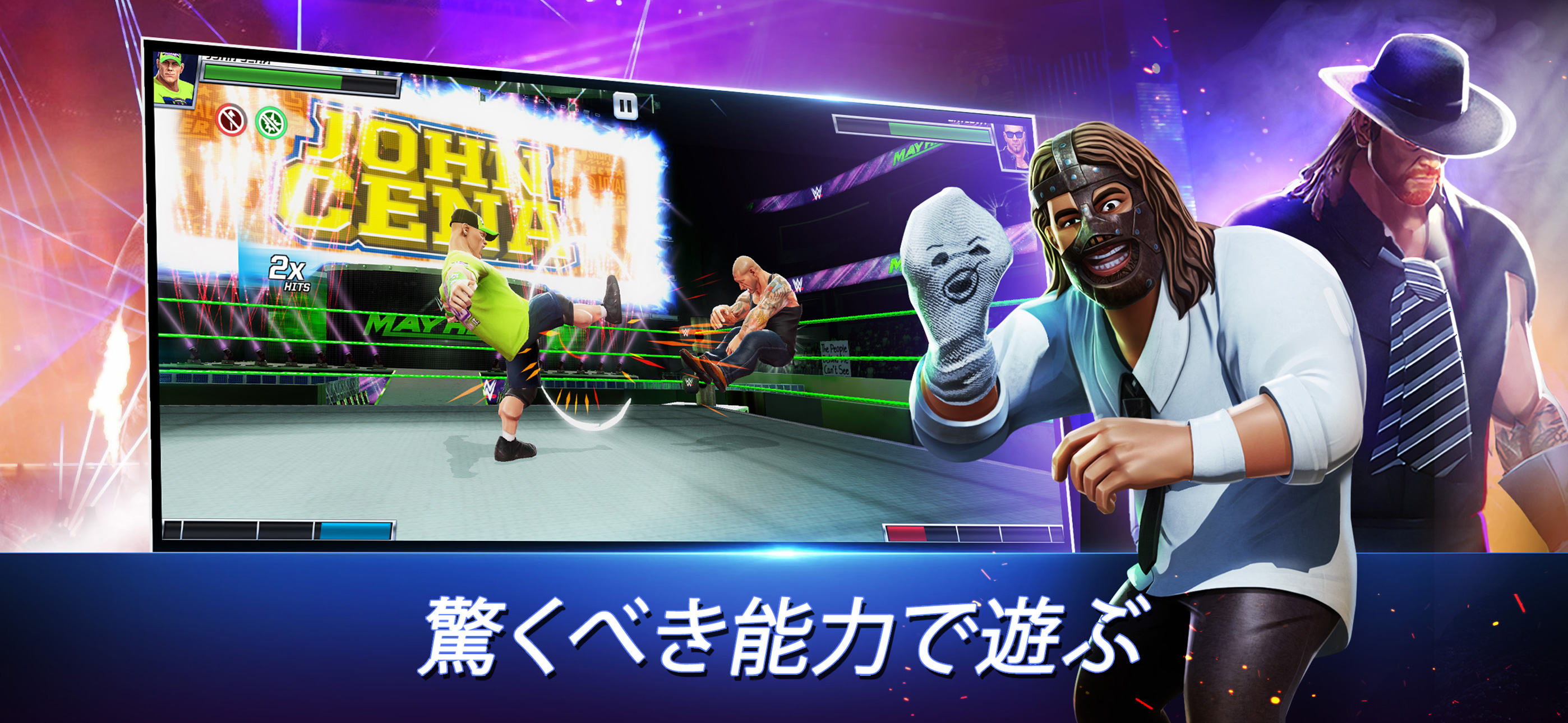 ジョンシナ、ザロック、アンドレザジャイアント、トリプルH、ザビエルウッズ、AJスタイルズ、ストーンコールドスティーブオースティン、ローマンレインズ、ランディオートン、スティング、セスロリンズなど、WWEスーパースターとWWEレジェンドの増え続ける名簿から選択してください、Jinder Mahal、Big E、Fiend、Charlotte Flair、Bayley、Asuka、Alexa Bliss、その他多くの不死身。