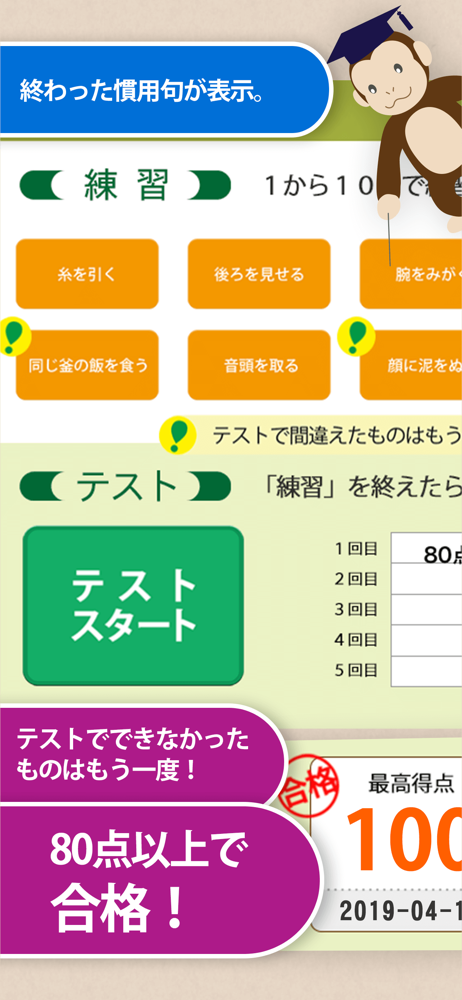 「慣用句マスター」は、知っておくと為になる慣用句を200語収録した練習アプリです。