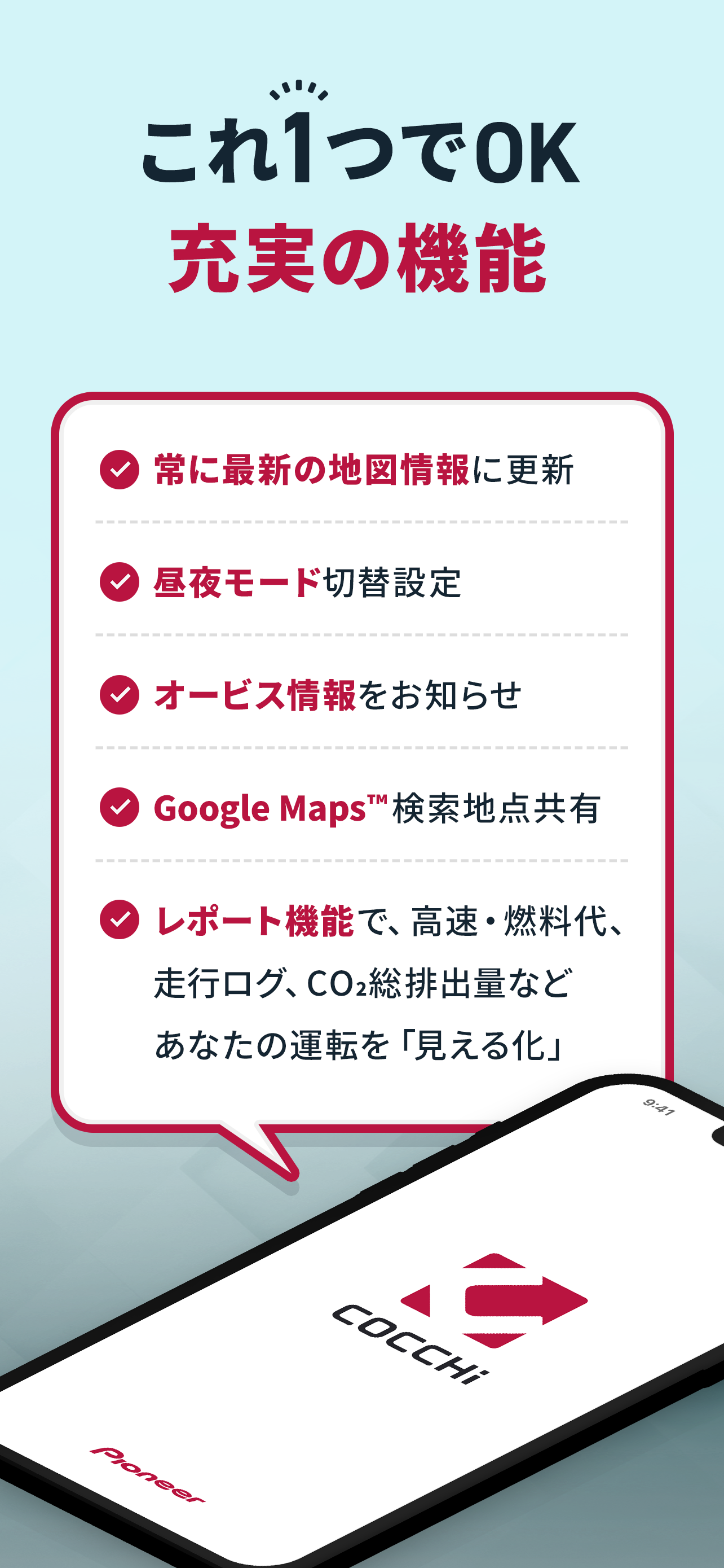 カロッツェリアのノウハウを活かした、カーナビメーカーならではの本格的なカーナビゲーションアプリ『COCCHi(コッチ)』を、ぜひご利用ください。