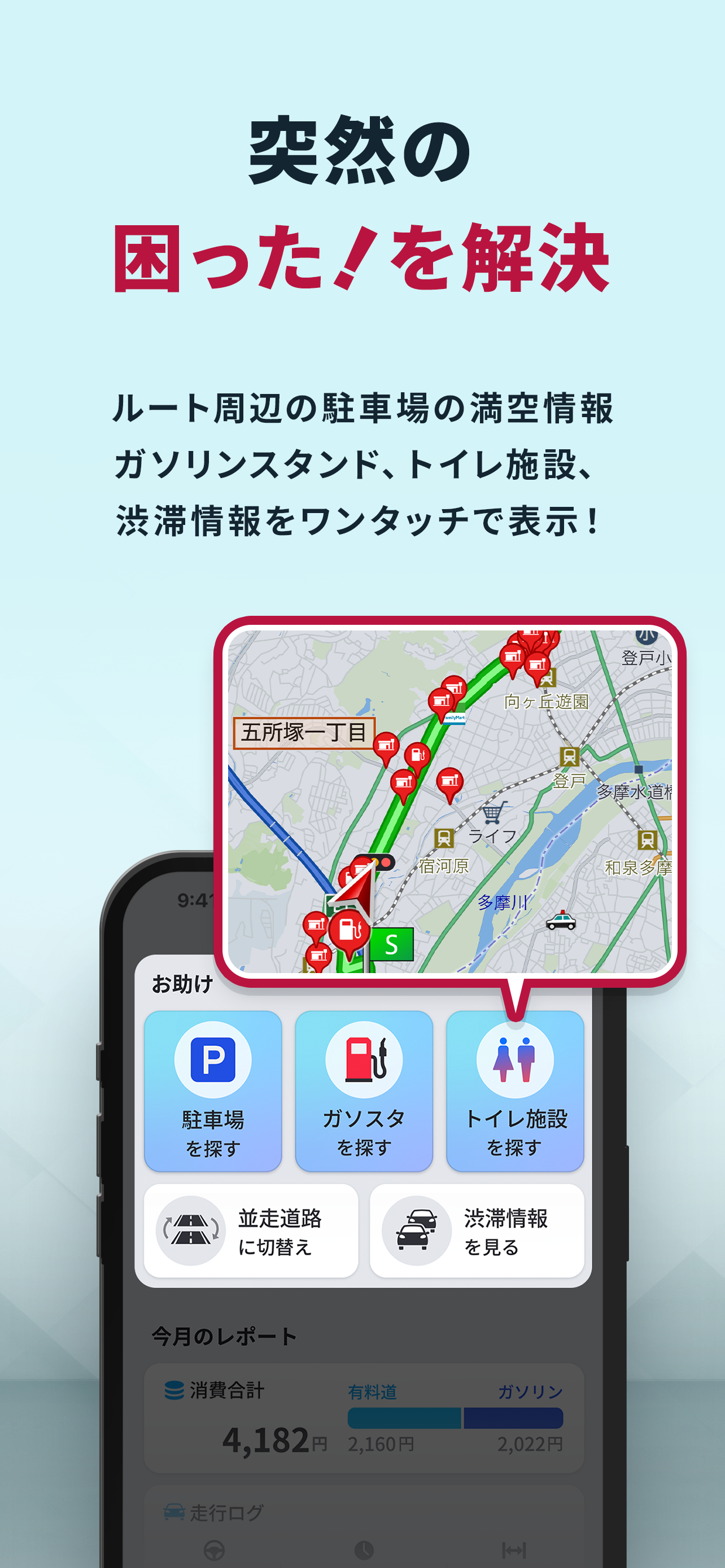 ・ナビゲーションだけでなく、運転による様々なコストもアプリ一つで把握可能