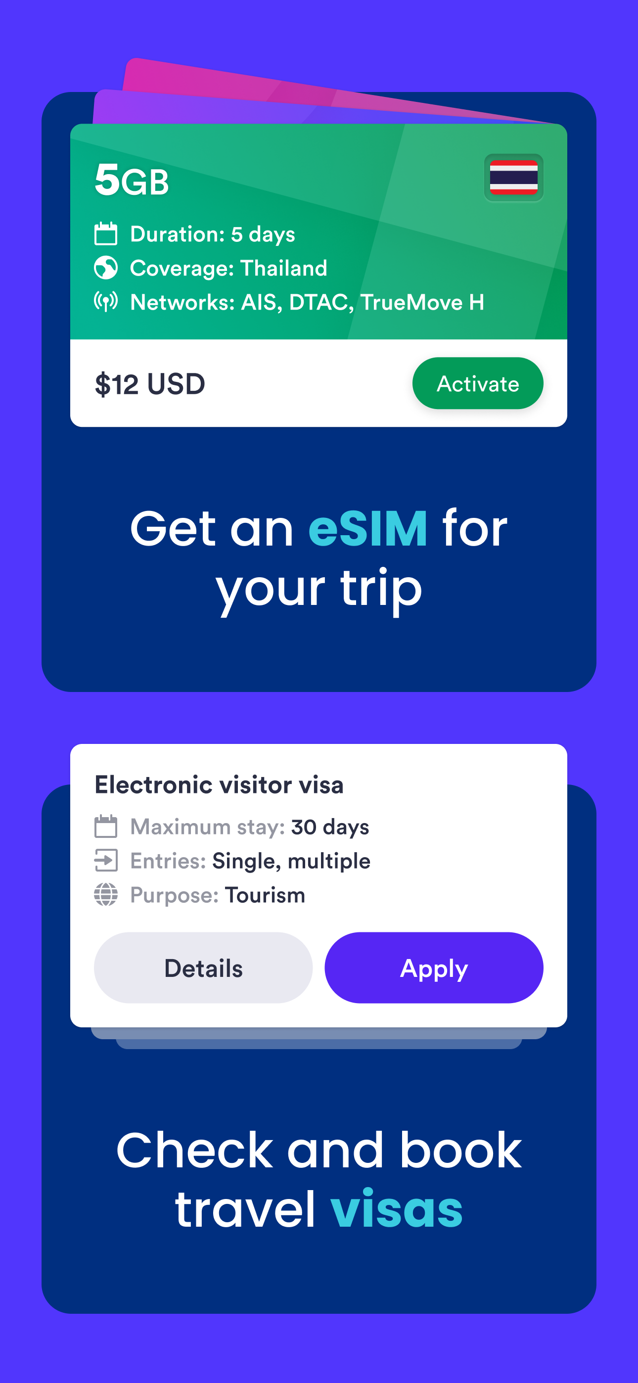 Get real-time info you need to know before you travel including eSIMs, visa applications, weather insights and more