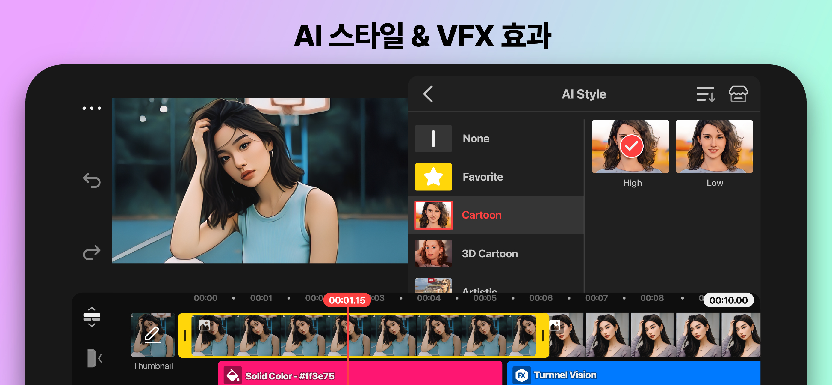 ● AI 스타일: 영상에 예술적 감성을 더하는 AI 효과 제공