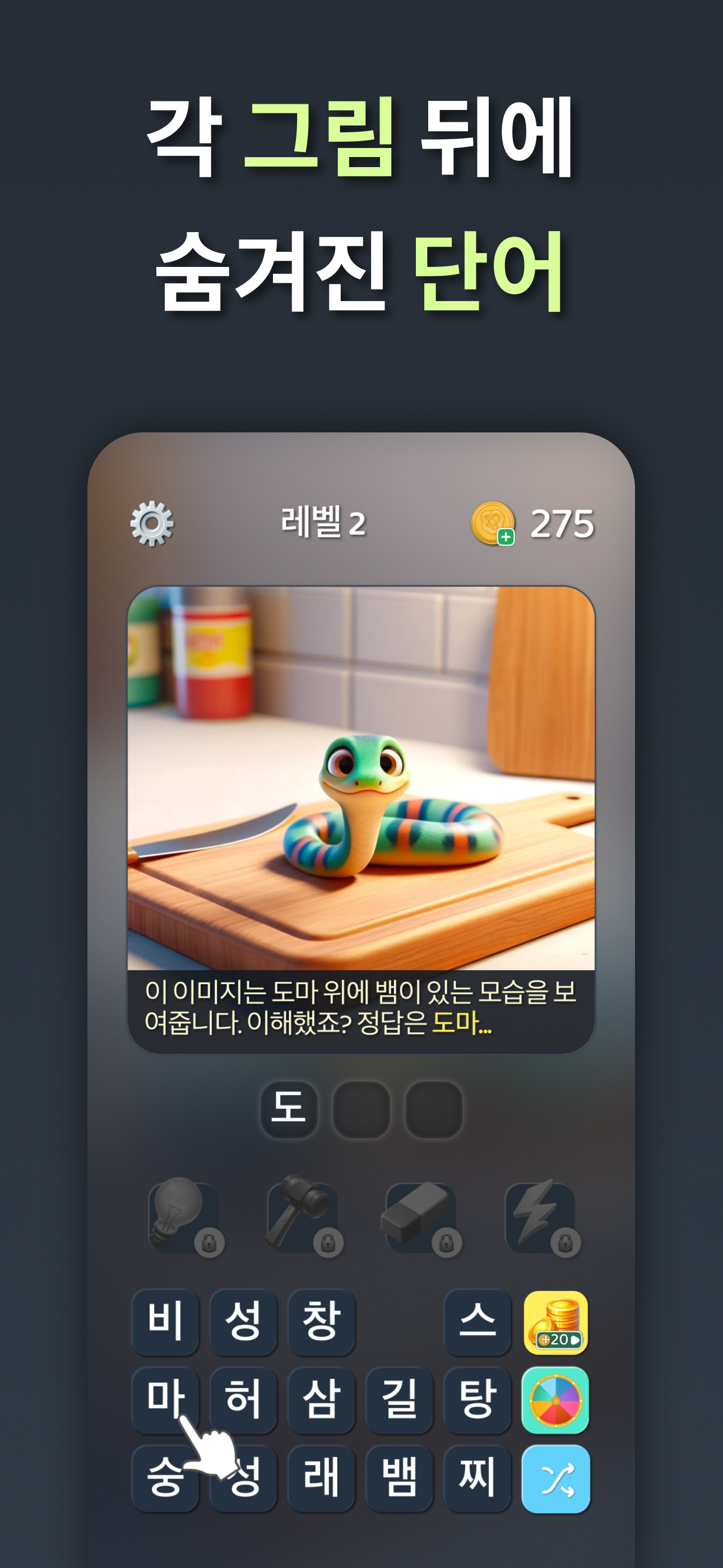 모든 사람을 위한 도전: 쉬운 것부터 난이도가 높은 것까지, 모든 플레이어를 위한 레벨이 준비되어 있습니다. 맞춘 단어마다 코인을 얻고, 막힐 때는 힌트를 사용하세요.