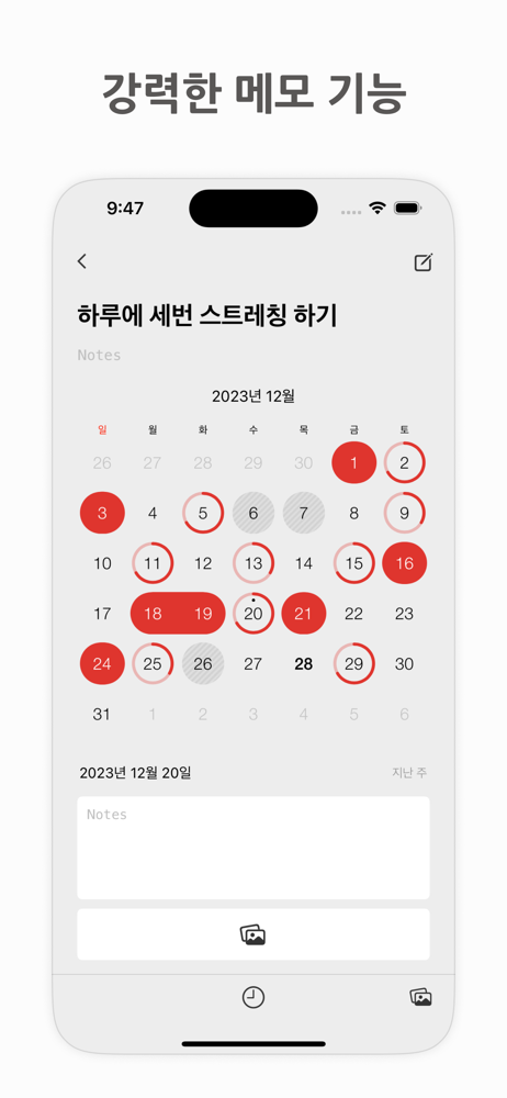 • 하루하루 쌓이는 기록을 보며 습관을 지속하는 원동력을 얻을 수 있습니다.