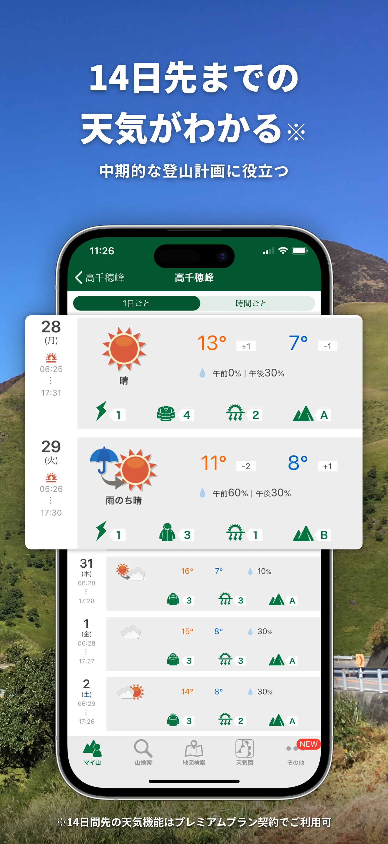・カレンダー機能で、2週間の天気予報*や登山指数、落雷、服装指数などを山毎に確認
