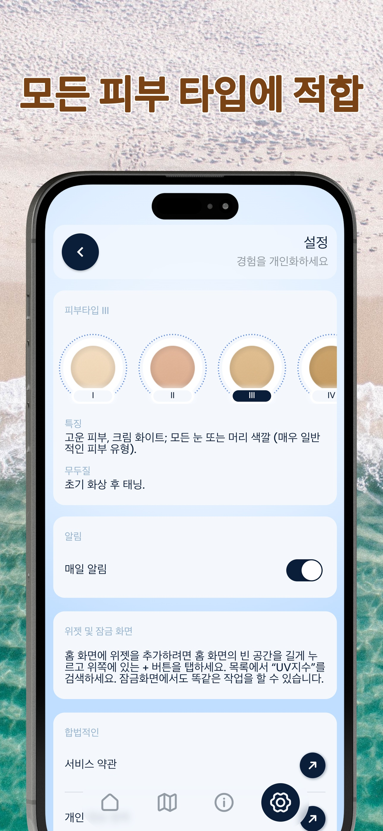 태양 노출에 대한 피부 반응에 따라 개인을 분류하는 Fitzpatrick 척도에 따라 피부 타입을 선택할 수 있습니다. 그런 다음 햇볕에 타기 전에 최대 태양 노출에 대한 개인화된 값을 얻을 수 있습니다.