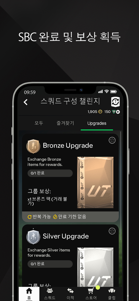 컴패니언 앱으로 SBC를 놓치지 마세요. 클럽의 잉여 선수를 교환하여 새로운 선수, 팩 또는 커스터마이징 옵션을 해제하세요.