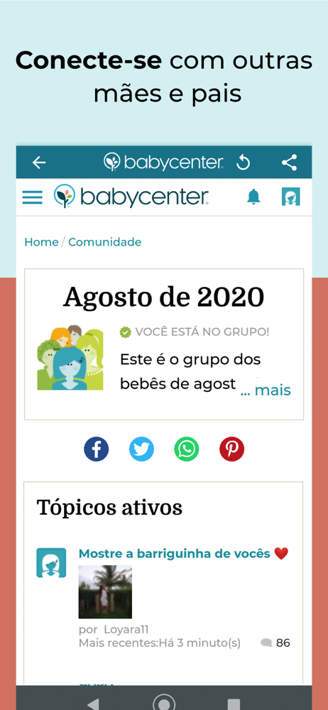 Você vai ter na sua mão ferramentas divertidas e úteis como a galeria de fotos da barriga, a pesquisa de nomes e muito mais. E vai ter acesso no BabyCenter aos premiados vídeos sobre a gravidez, à maior comunidade de grávidas do mundo e a milhares de artigos revisados por médicos para ajudar você nesta jornada.
