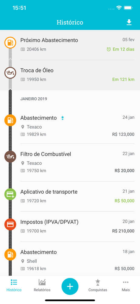 Com a ajuda do app, você pode configurar lembretes para controlar serviços regulares, como troca de óleo, substituição de pneus, inspeção e revisão, podendo agendar por quilômetro ou data.