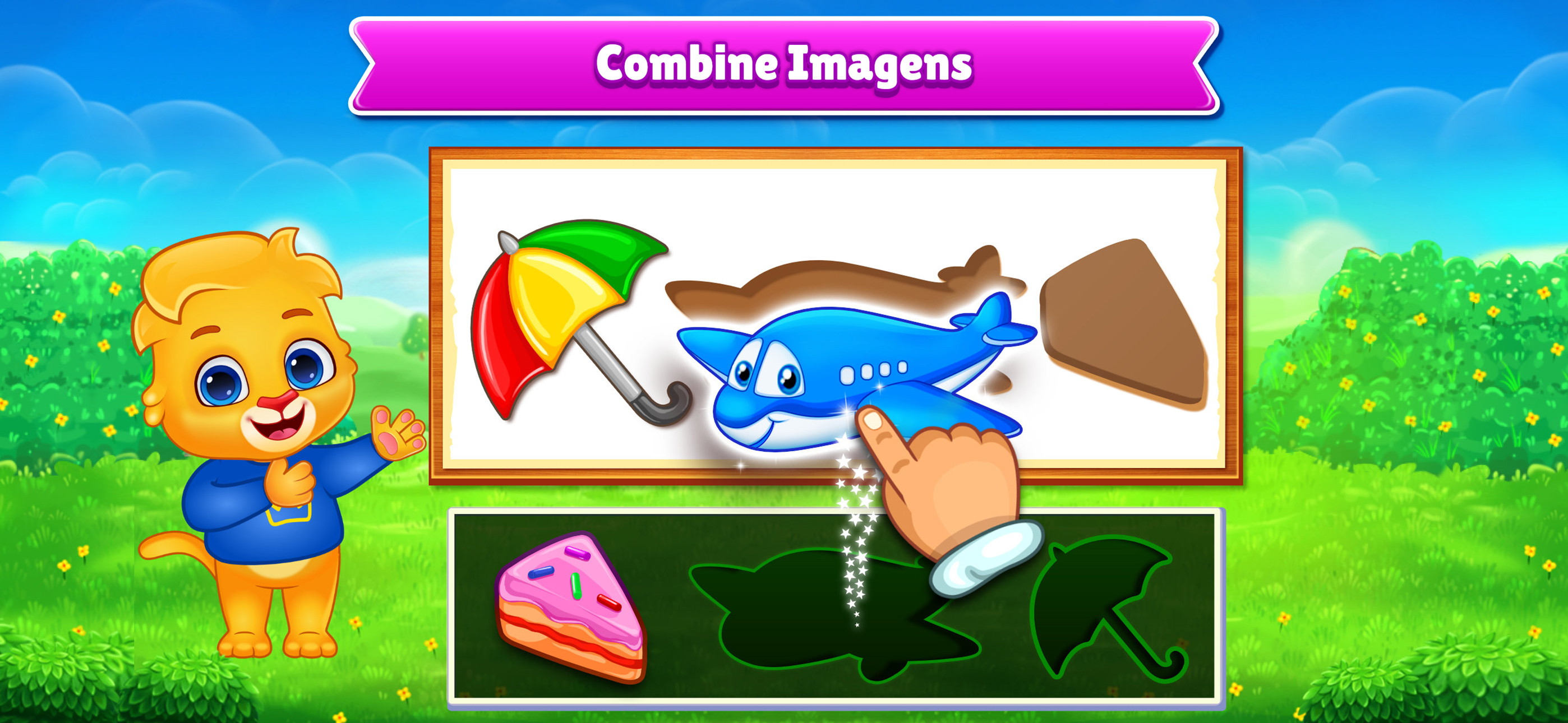 2. Criação de objetos - Uma forma é exibida com uma série de peças espalhadas. As crianças precisam combinas as formas individuais e arrastá-las para formar a imagem maior, revelando uma figura divertida.
