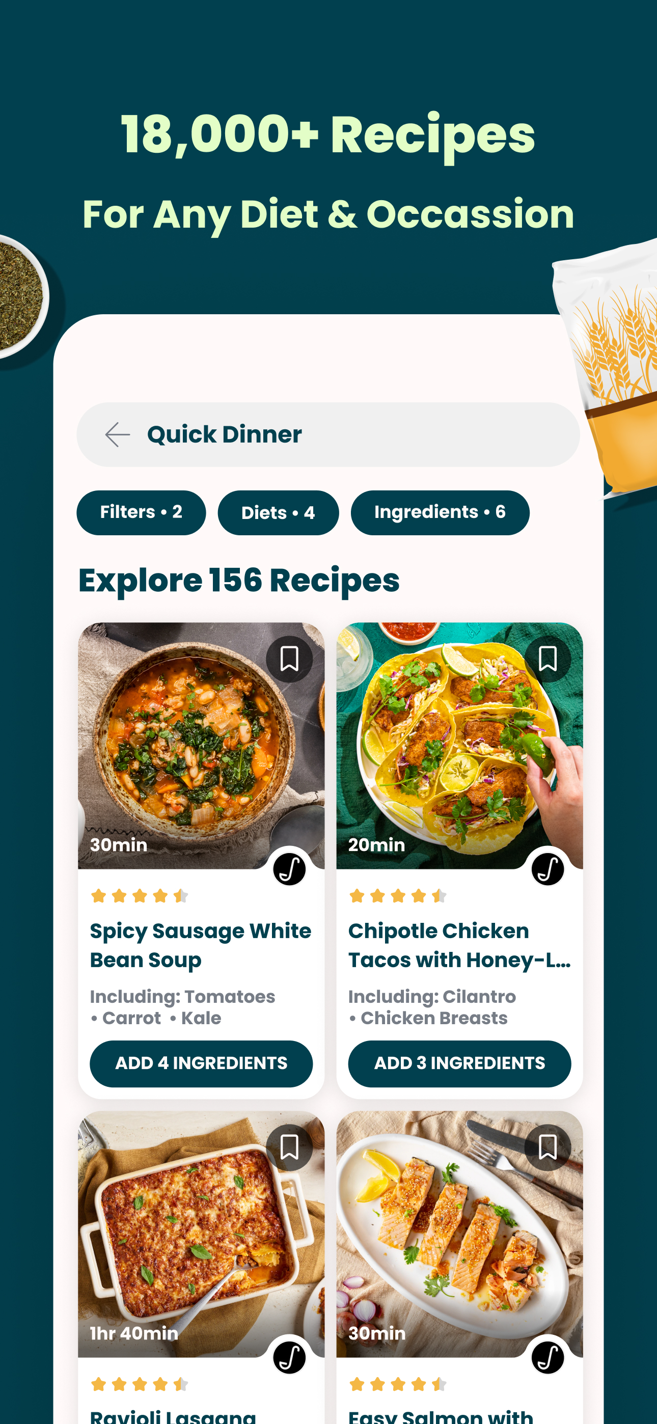 Quickly find recipe inspiration tailored to your preferences. Filter by dietary requirements, allergies, food preferences, and ingredients you already have at home to find a recipe you like in less than one minute.